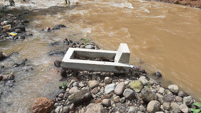 Karmaji menjelaskan penyusutan tersebut terjadi akibat tebing lahan makam terus terkikis oleh aliran Sungai Cigading yang mengalir di sepanjang sisi lahan pemakaman.